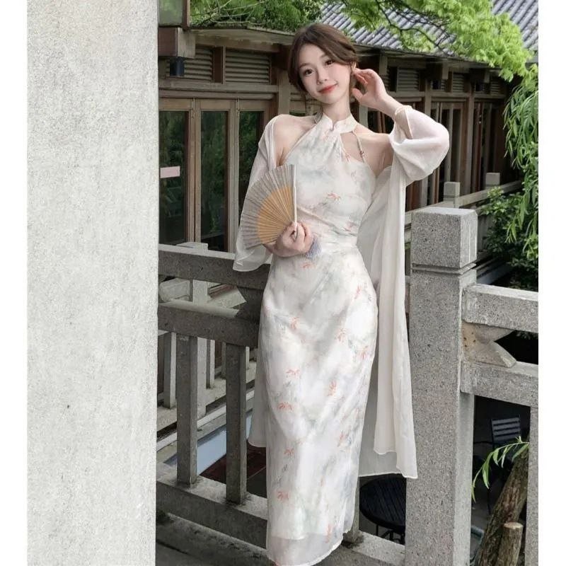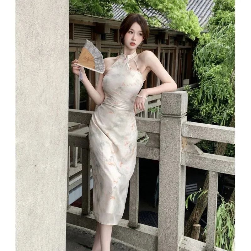 New Chinese Style Young Girl’s Improved Halterneck Cheongsam Dress for Women Summer Ink Painting Chinese Style Zen Waist Long Skirt