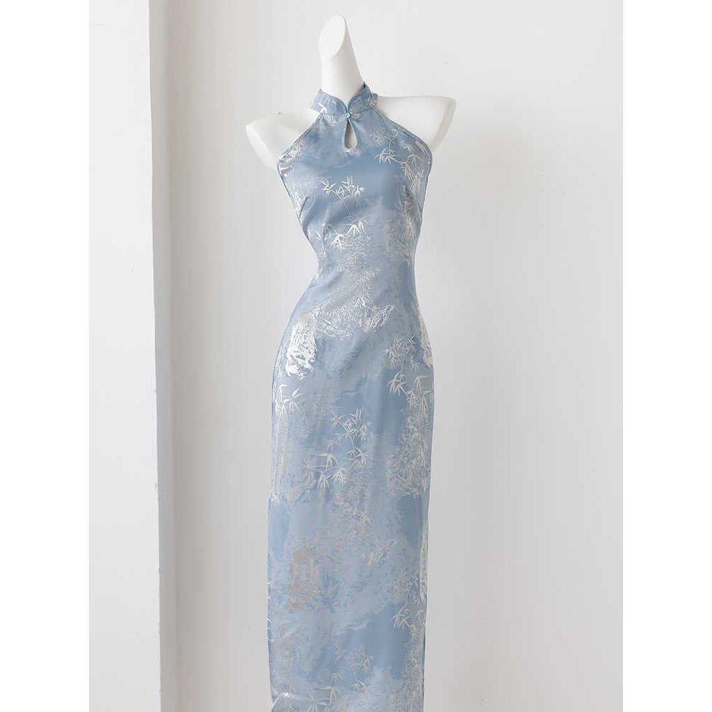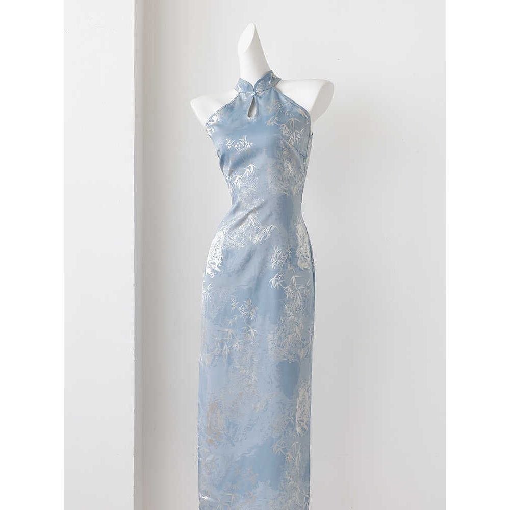 Wear neck improvement cheongsam female blue bamboo leaves new Chinese new summer sleeveless waist tok dress national style